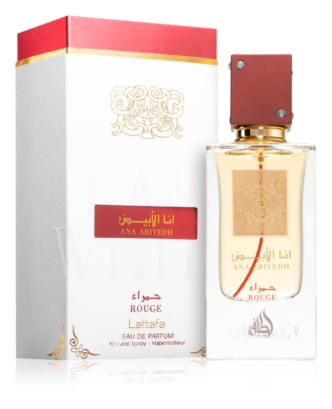 Ana Abiyedh Rouge de Lattafa Perfumes es una fragancia de la familia olfativa Amaderada Especiada para Hombres y Mujeres. Las Notas de Salida son Pera Nashi, kumquat (naranja enana) y bergamota; las Notas de Corazón son caramelo y geranio; las Notas de Fondo son ámbar gris, almizcle y musgo de roble.